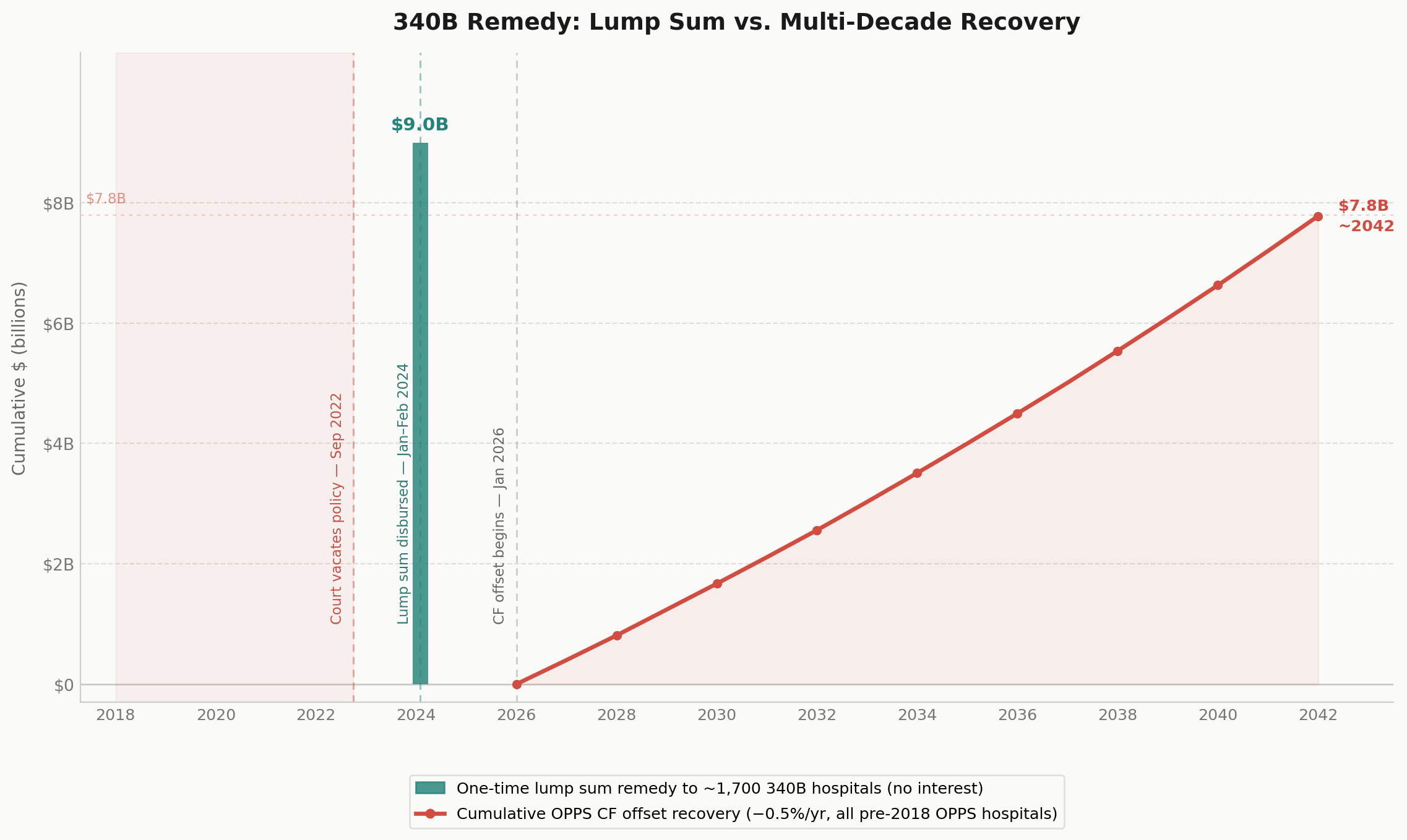 The cost recovery mechanism — the conversion factor offset: To fund the remedy without exceeding OPPS budget authority, CMS reduces the OPPS conversion factor for non-drug items and services by 0.5% per year. The conversion factor is the multiplier that translates APC relative weights into dollar payment amounts for every non-drug, non-device OPPS service. The 0.5% annual reduction applies to all OPPS hospitals enrolled before January 1, 2018, and continues until the cumulative reduction equals $7.8 billion — a timeline that runs approximately through 2041 at the current rate.