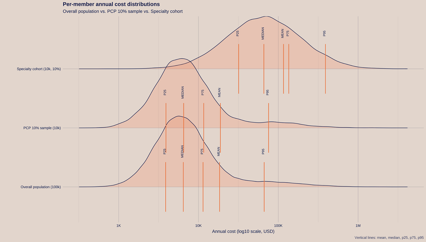 A per‑member distribution plot makes the contrast obvious. A PCP carve‑out that manages a random 10% panel behaves like the overall population (a random slice of the book). A specialty carve‑out concentrates the right‑tail of the distribution—exactly the costs that make plan‑level results volatile.