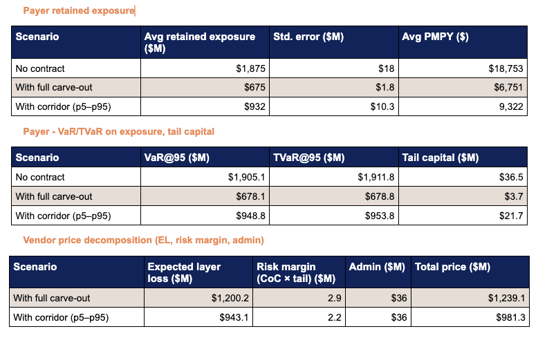We then compare the payer’s retained exposure (claims only) under three scenarios: no contract, full carve‑out, and a p5–p95 corridor on the specialty cohort.