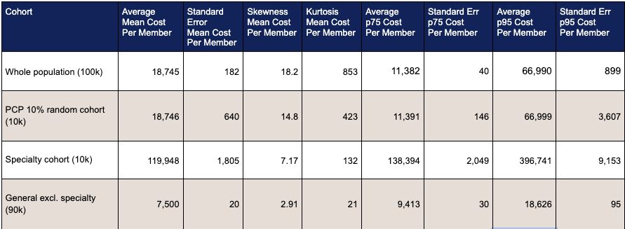 In the summary table, two things stand out. First, the whole population and PCP 10% cohorts have nearly identical average per‑member costs; the PCP panel just has a larger standard error because it’s smaller. Second, when you remove the specialty cohort, you not only lower the average per‑member cost but also make the tail (p75/p95) far more predictable—exactly the point of moving higher moments off the payer’s books.
